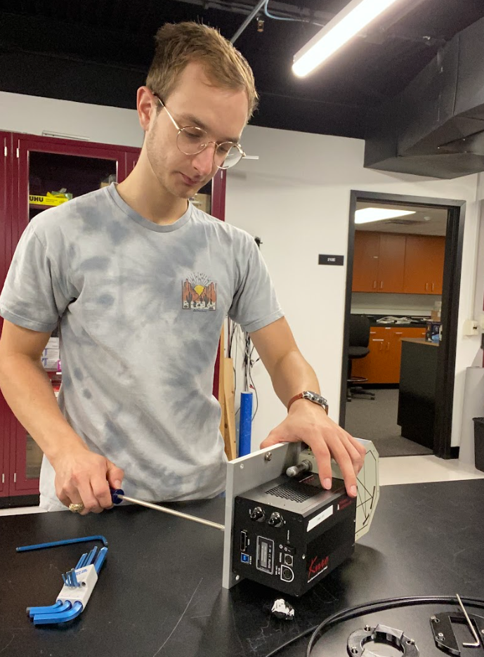 Our part in the prototype testing was assembling the spectrograph, done by undergraduate Mason Jelken. There are three main hardware components for this system. The spectrograph to spread the light into its spectra, the detector to collect the light information from the spectrograph, and a fiber-optic USB relay device. The spectrograph is an ORIEL MS125J spectrograph, a compact system that has an adjustment screw to change the bounds of the spectra. The original optics were made to observe only one source at a time, so a cylindrical lens is added to reduce effects of the inherent astigmatism in the images. The detector is a KURO 2048B sCMOS detector from Teledyne Princeton Instruments. The fiber-optic USB relay device allows for control and data collection at a greater distance. These components are joined via two aluminum plates designed and fabricated in the lab that also mounts this system to the OSI DFPS.