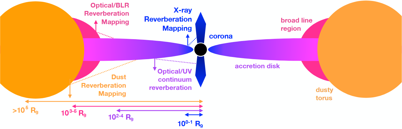 One example of a science project TAMPICO can facilitate is the study of variable optical emission in Active Galactic Nuclei (AGN). The inner regions of AGNs are too compact and distant to be spatially resolved with most instruments, but the reverberation mapping (RM) technique can map out the geometry of inner regions, as shown in the figure below. TAMPICO is suited for the continuum and broad line region methods.